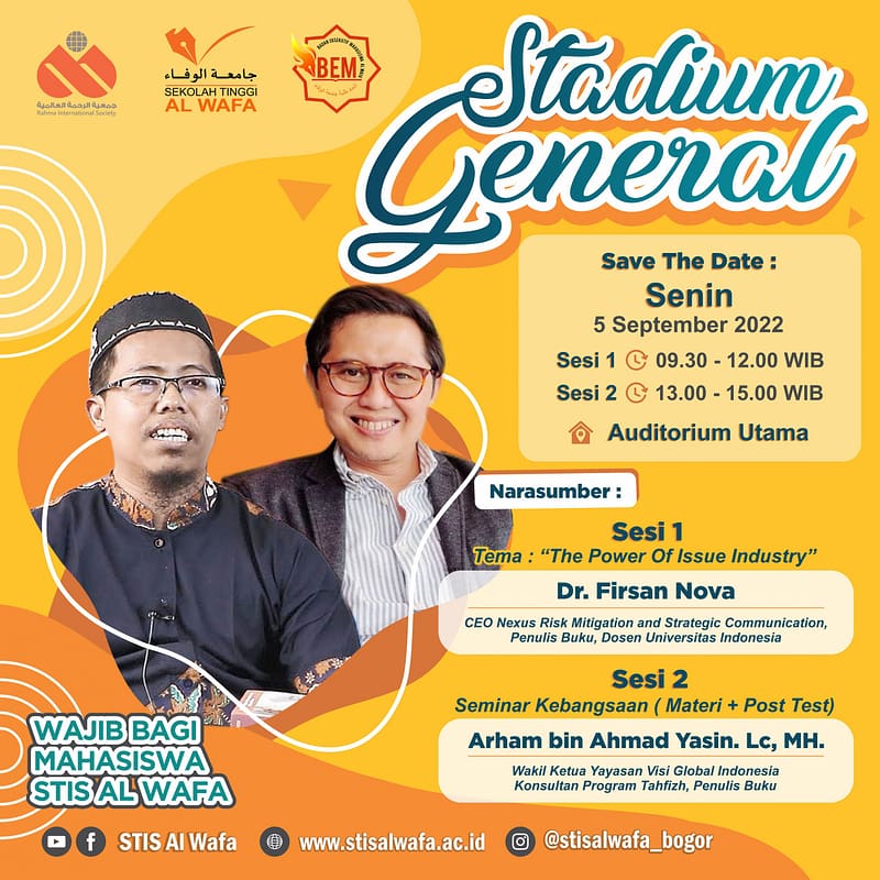 Stadium General dan Seminar Kebangsaan Acara ini diselenggarakan pada Senin 5 September 2022 di Aula Utama STIS Al Wafa, sebagai ucapan selamat datang kepada seluruh mahasiswa STIS Al Wafa dalam menyambut awal semester Ganjil. Mengawali pertemuan dengan kegiatan yang sangat bermanfaat untuk mahasiswa dalam menambah wawasannya, dengan mendapati pengetahuan dari para narasumber yang Masya Allah […]